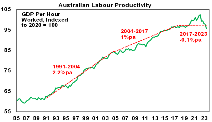 Productivity growth is unlikely to be as bad as it looks, but is still a big concern. The RBA has noted that wages growth is consistent with the inflation target but only if productivity picks up. So far it’s still falling. We know productivity growth has been slowing for years for structural reasons but quite why productivity has fallen so badly over the last year is a bit unclear. However, it may be related to a combination of the normal lag from a slowing economy to a slowing jobs market, labour hoarding and the relative growth of the less productive services sector upon reopening. If so, we should expect some improvement ahead. But fundamental economic reforms (around tax, industrial relations, skills, etc) are required to get productivity growth back to the long-term norm of 1.5%pa.