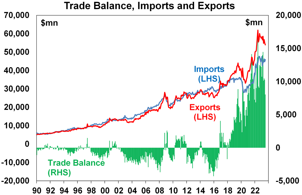 We continue to see the RBA leaving rates on hold ahead of rate cuts next year. The latest RBA meeting left rates unchanged again as widely expected with few surprises. With inflation still high the RBA understandably retained a tightening bias indicating that the risk of a further increase in interest rates remains high and the further fall in productivity seen in the June quarter and recent surge in petrol prices will reinforce this. However, if as we expect the economy continues to weaken as past rate hikes increasingly bite this will maintain downwards pressure on inflation heading off any further rate hikes and ultimately allowing the RBA to cut rates next year. We are allowing for the first rate cut in the March quarter next year, albeit the risk is that this may be delayed if productivity remains poor, services inflation sticky and if home prices continue to surge (boosting household wealth).