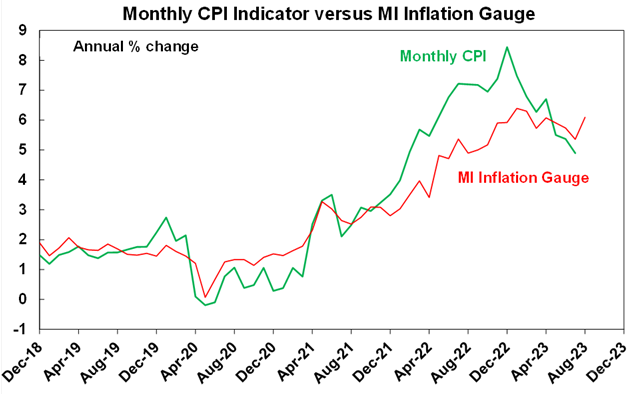 The Melbourne Institute’s Monthly Inflation Gauge picked up to 6.1%yoy in August – but its hard to know how good a guide this as it lagged the ABS’s inflation measures on the way up and so may be doing the same on the way down.