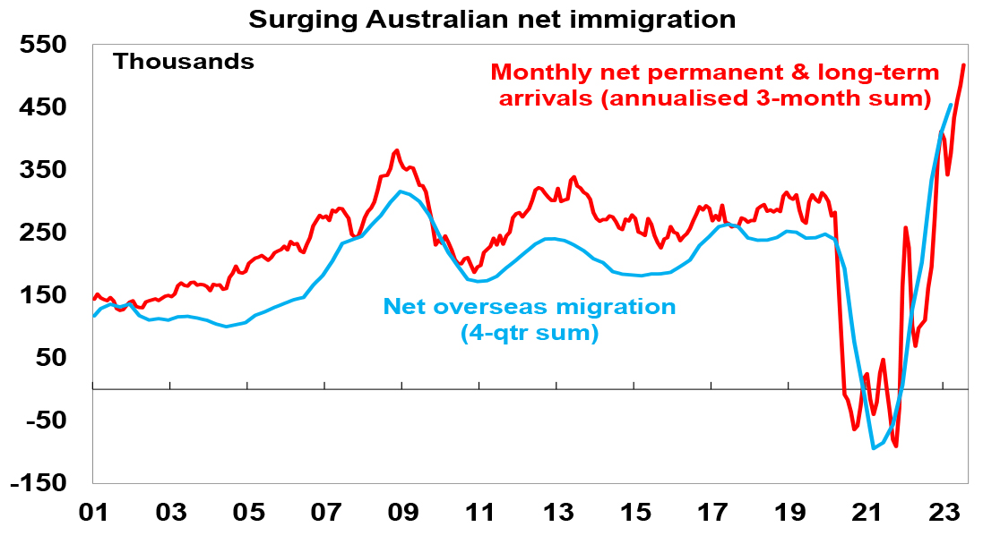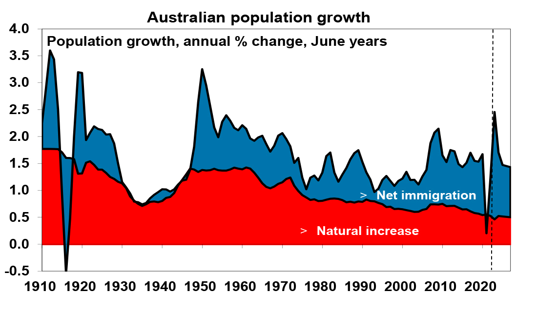 Source: ABS, AMPThis would take population growth to 2.5% in 2022-23, its fastest since the 1950s. Note the next chart assumes net immigration falls to 315,000 this financial year and 260,000 thereafter as consistent with the May budget projections, but budget immigration projections have been very unreliable. For example, net immigration for 2023-24 was projected to be 213,000 in the March 2022 Budget, 235,000 in the October 2022 Budget and 400,000 in the May Budget but now looks like 500,000 or more.