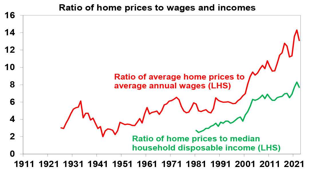 Housing supplyThe good news is that Australian governments appear at last to be serious about focusing on supply as a key to improving housing affordability. The target to build 1.2 million new homes over five years from July 2024 (or 240,000 pa) -supported by 50,000 social and affordable homes over five years from the Housing Australia Future Fund and the National Housing Accord along with various programs to incentivise states to build more homes - are to be welcomed. Over the five years to 2022 Australia built nearly one million new homes (or 200,000 pa) mostly in the private sector but we need a stretch target to solve the housing affordability issue given a shortfall of 165,000 to 285,000 dwellings by mid next year. However, this is not going to be easy. First, despite a backlog of approvals yet to be completed we are struggling to complete 180,000 dwellings pa with labour and material shortages and regular failures amongst homebuilders. We may be able to get this back up to 200,000 pa with more units/lower cost housing in the mix (like late last decade) but it’s hard to see where the capacity is going to come from to get to 240,000 dwellings a year.