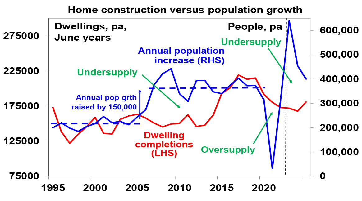 Population growth and Australia’s housing shortfallStarting in the mid-2000s annual population growth jumped by around 150,000 people on the back of a surge in net immigration levels – see the blue line in the next chart. This should have been matched by an increase in dwelling completions of around 60,000 per annum but there was no such rise in completions until after 2015 leading to a chronic undersupply of homes – see the red line. The unit building boom of the second half of last decade and the slump in population growth through the pandemic helped relieve the imbalance but the unit building boom was brief and a decline in household size from 2021 resulted in demand for an extra 120,000 dwellings on the RBA’s estimates. The rebound in population growth has taken the property market back into undersupply again.