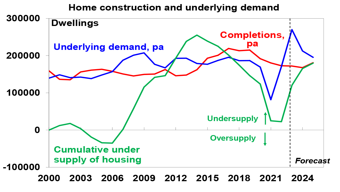 Source; ABS, AMPThe next chart looks at this in terms of underling demand (blue line) and supply (red line) for homes and the cumulative undersupply gap between them (green line). Up until 2005 the housing market was in rough balance. It then went into a massive shortfall of about 250,000 dwellings by 2014 as underlying demand surged with booming immigration. This short fall was then cut into by the unit building boom and we nearly got back to balance in the pandemic. A rebound in underlying demand on the back of this year’s immigration surge and weak completions has now pushed the shortfall back up to 120,000 and by mid next year it will be around 165,000. This makes no allowance for the pandemic induced fall in household size which could take the shortfall up to around 285,000.