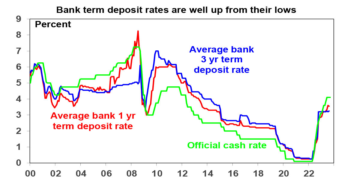 It's relatively simple for cash and bondsAn obvious example of where the starting point valuation matters critically is cash. If the interest rate on offer from a term deposit rate is low as was the case into early last year when rates were 0.5% or less then it means pretty poor returns. Recently term deposit rates have increased with the RBA cash rate and so are offering a more attractive return potential, albeit they are still down from levels around 6-7% in 2010.