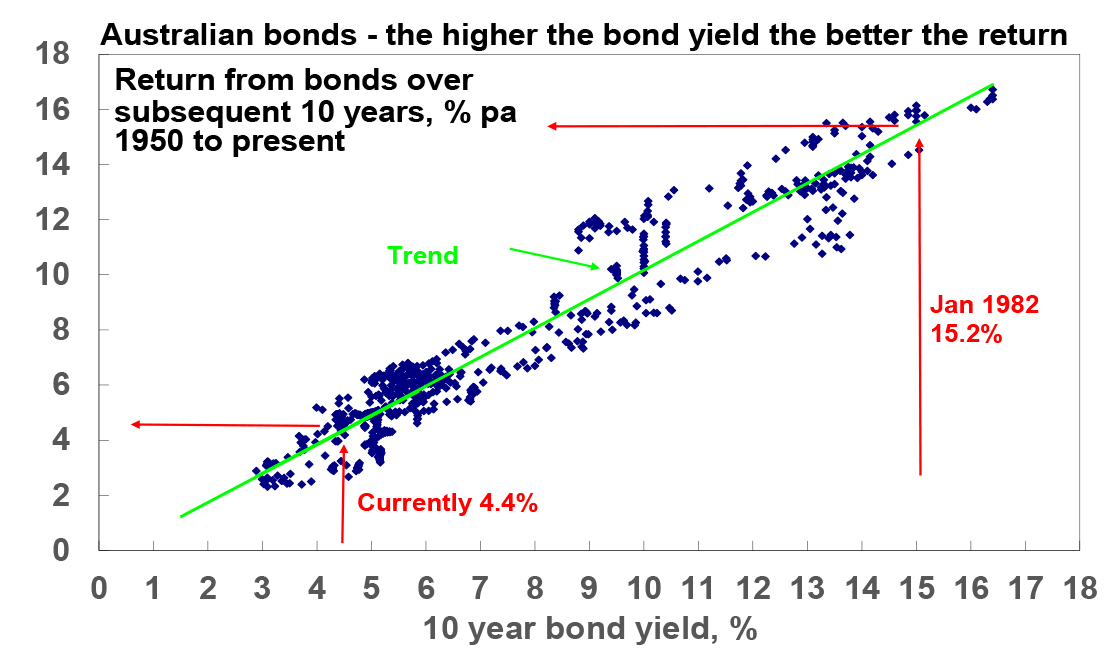 Source: Bloomberg, AMPWhen bond yields are high, they set up high bond returns over the medium term and vice versa. For example, Australian 10-year bond yields in January 1982 were 15.2% and it’s not surprising that bond returns over the next 10 years were 15.4%. At their low point of 0.6% in 2020 they were pointing to very low returns but they have now increased to around 4.4% pointing to better medium term returns, albeit still historically low.