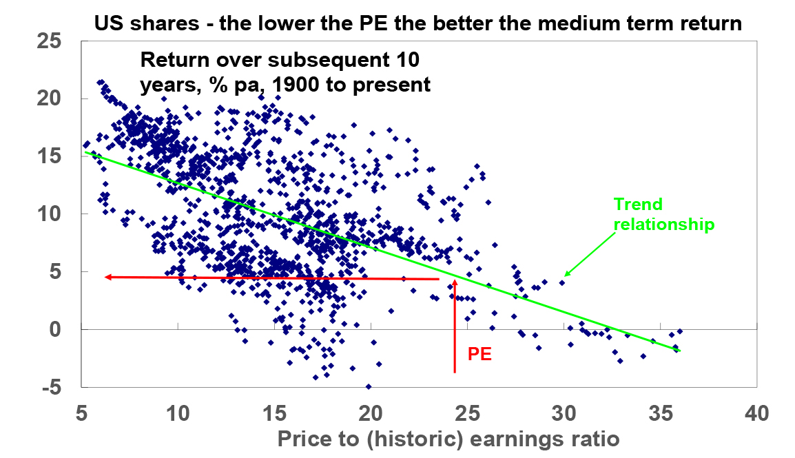 For shares a similar relationship holds. The following chart shows a scatter plot of the price to trailing 12 months earnings ratio for US shares since 1900 (along the horizontal axis) against subsequent 10-year total returns (ie, dividends plus capital growth) from US shares. While the relationship is not as smooth as that for bonds as there is much more involved in share returns, it is a negative relationship. That means when share prices are high compared to earnings, subsequent returns tend to be low and vice versa. The best time for shares is after PEs have fallen to single digits.