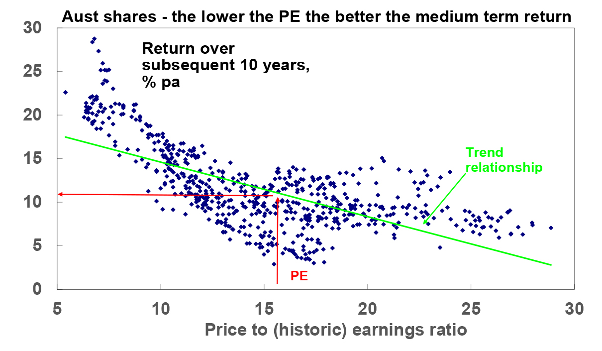 Source: Bloomberg, AMPThe next chart shows the same for Australian shares from 1962, as a PE series is not available before then. Again, there is the expected negative relationship between the level of the PE and subsequent total returns (based on the All Ords Accumulation Index) with the best returns coming after periods of low PEs. For example, at the end of the mid-1970s bear market in September 1974 the PE was just 5.4 times which was a great time to buy as Australian shares returned 21.8% pa over the next decade.