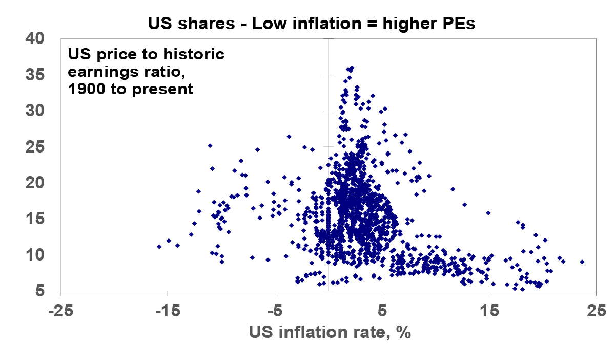 - Finally, the appropriate level of valuation will vary with inflation and interest rates. In times of low inflation, assets can trade on lower yields as the yield structure in the economy falls, uncertainty falls and (for shares) the quality of reported earnings improves. This means higher PEs. So low inflation, say down to 2%, can be good for shares via higher PEs as seen in the next chart. The shift from the high inflation of the 1970s and 1980s to the low inflation last decade was very positive for shares. But if inflation rises resulting in higher interest rates, then shares should trade on lower PEs as investors find shares less attractive, uncertainty rises and earnings quality falls. This of course was a major factor weighing on share markets last year.