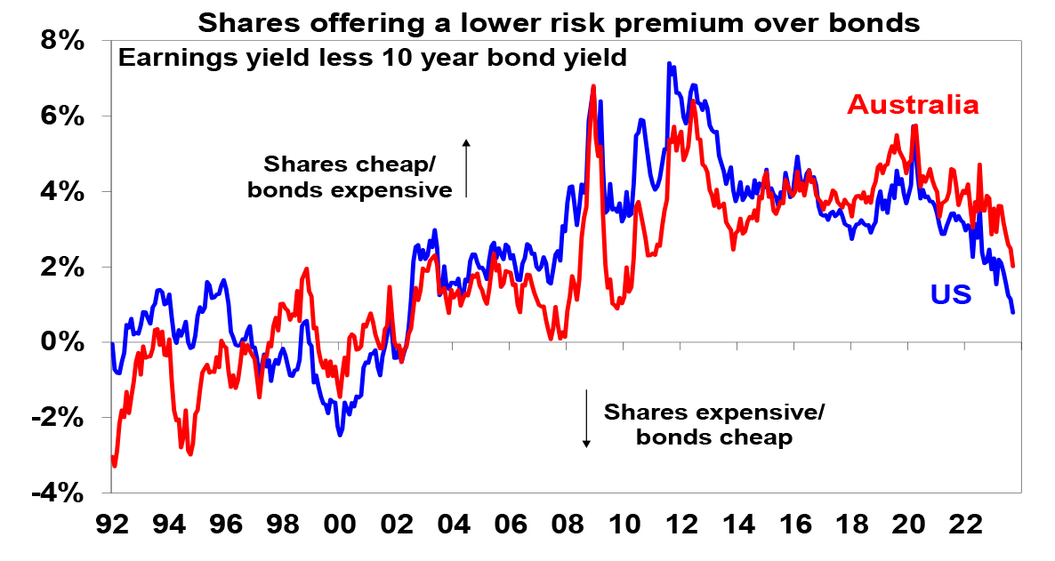 Shares – PE ratios for shares point to a medium-term return potential of around 10% for Australian shares but just 5% for US shares (see the red lines on the PE charts earlier). Allowing for the rise in bond yields – by subtracting 10-year bond yields from the earnings yields (using forward earnings) – shows US and Australian shares now offer a reduced return premium over bonds of around 0.8% in the US and 2% in Australia. See the next chart. For the US this is the lowest risk premium over bonds since after the tech wreck whereas current uncertainties (around interest rates, recession risk & geopolitics) suggest the risk premium should ideally be higher. Fortunately, that for Australian shares is more attractive. But ideally bond yields need to fall to improve the prospects for shares. If we are right and inflation continues to fall over the year ahead, then this should allow lower bond yields and provide some support to shares. But in the near term the risk of a further correction in share markets led out of the US remains high reflecting the deterioration in US share valuations particularly for tech stocks which are very sensitive to bond yields.