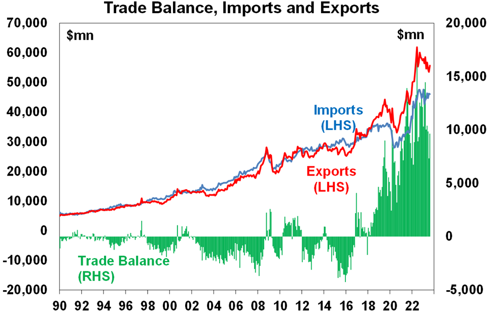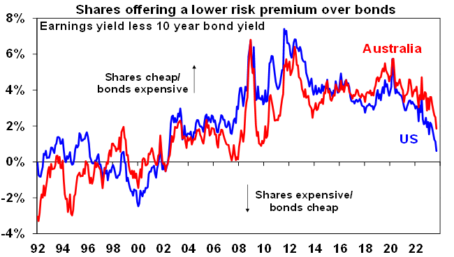 Shares were oversold at technical support and due for a bounce which we saw late in the last week, but the risk of a further correction is high. The continuing rise in bond yields has pushed the risk premium the US share market offers over bonds to its lowest in over 20 years, and that in Australia to its lowest since 2010. While the drivers of the back up in bond yields are arguably less threatening than was the case last year, being less due to inflation and more due to hopes of a soft landing, the risk of recession remains very high and is arguably rising again in the US on the back of the financial tightening flowing from higher bond yields. The combination of the high risk of recession, uncertainty around the Chinese economy and US politics going from bad to worse with the removal of the House Speaker McCarthy all suggest the risk premium offered by shares over bonds should be higher than it is now, which in turn implies a high risk of more downside for share markets unless bond yields pull back.