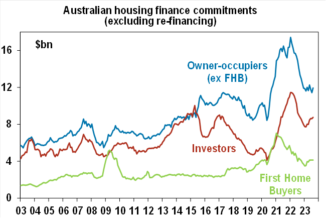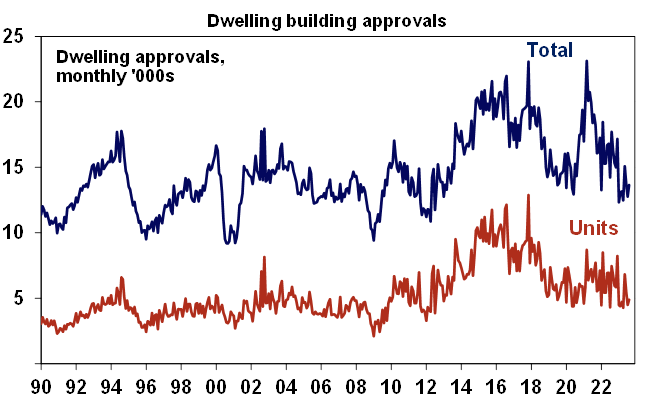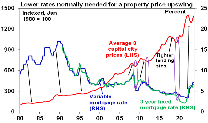 Meanwhile, CoreLogic data showed home prices up 0.8% in September. Revised data shows prices now up by 6.6% from their January low and although the pace of growth has slowed from May when it was 1.2%mom it’s still solid suggesting the underlying supply shortfall in the face of surging immigration is continuing to dominate the impact of rate hikes. Prices are now on track for an 8-9% rise this year and our base case remains for a 5% rise next year as the RBA starts to cut rates. However, uncertainty is high given rising listings, increasing levels of mortgage stress and the dampening impact on demand from reduced buying capacity as a result of the surge in mortgage rates since May last year. Normally property price rebounds are preceded by rate cuts so the rebound this year has run ahead of the normal relationship with rates, see ovals in next chart.