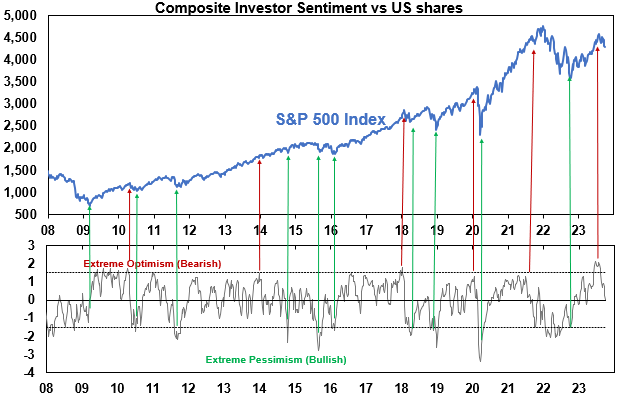 Based on surveys of individual investors, investment newsletter writers, option positioning and VIX. Source: Bloomberg, Sentimentrader, Investors Intelligence, AMP