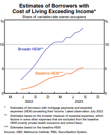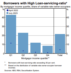 - Looked at another way the share of households with a variable rate mortgage where mortgage payments exceed 30% of their income has increased to just over 20% in July from 4% in April last year, and to over 40% for low-income households. See the next chart. This is actually very high and is despite high income growth for low-income households. And just over 40% of borrowers have saving buffers that would be depleted in less than 3 months if they were to lose their income.