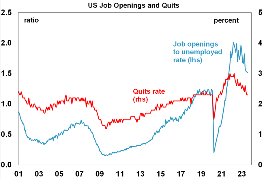 Major global economic events and implicationsUS economic data was messy. Payrolls surged by a much stronger than expected 336,000 in September, the prior two months were revised up by 119,000 and job openings rose in August all of which will keep the Fed hawkish and signalling “high for longer” interest rates. However, it’s not as strong as it looks: the trend in payroll growth is still down; the household employment survey rose by just 86,000; temporary employment which leads is falling; unemployment remained flat at 3.8% and is up from its low; the ratio of job openings to unemployed fell further; the quits rate and hiring rate remain in a downtrend; and wages growth slowed further to 0.2%mom or 4.2%yoy suggesting a degree of “goldilocks”. In other data, the ISM business conditions indicators were mixed with manufacturing up but still weak and services down but still solid. Prices paid indicators in both remained well down from their highs.