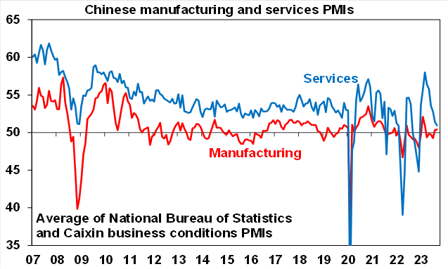 China’s Caixin business conditions PMIs fell in September offsetting the improvement seen in official PMIs and suggesting that smaller private firms (which have a higher weighting in the Caixin survey) are not doing as well as larger state-owned firms. Overall, it adds to the impression that growth has stabilised, but it still looks weak relative to pre-pandemic levels.