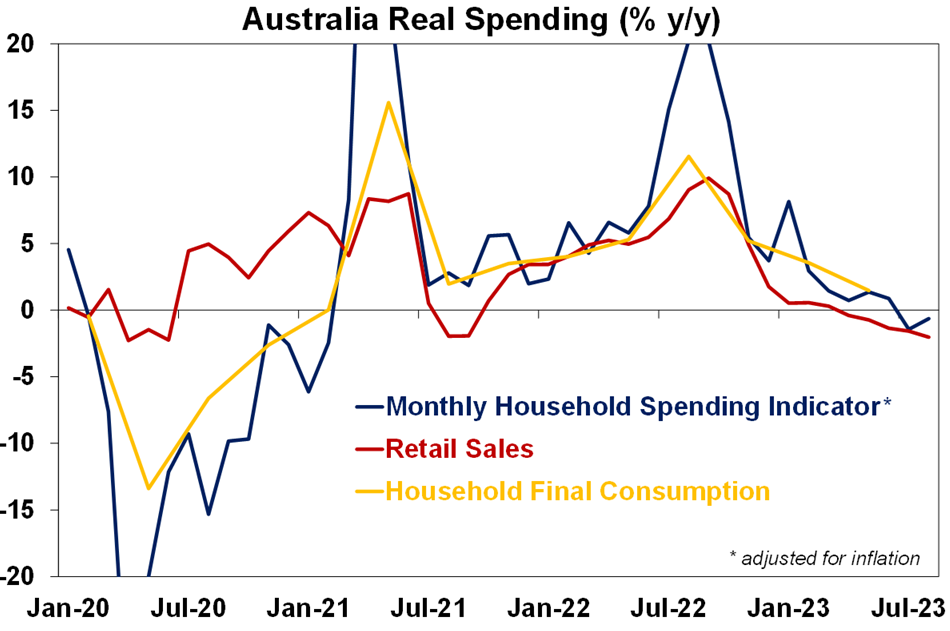 Australian economic events and implicationsAustralian economic data was mixed. The ABS’ experimental Household Spending Indicator which is based on bank card transactions data rose 4.8%yoy in August. While volatile (July was originally reported to be -0.7%yoy but now shows +3.4%yoy) the trend is down consistent with retail sales and after adjusting for inflation suggests annual growth in real consumer spending was flat or negative in the September quarter.