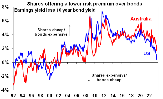 Outlook for investment marketsThe next 12 months are likely to see a further easing in inflation pressure and central banks moving to get off the brakes. This should make for reasonable share market returns, provided any recession is mild. But for the near-term shares are at high risk of a further correction given high recession and earnings risks, the risk of high for longer rates from central banks, rising bond yields which have led to poor valuations and the uncertainty around the war in Israel.