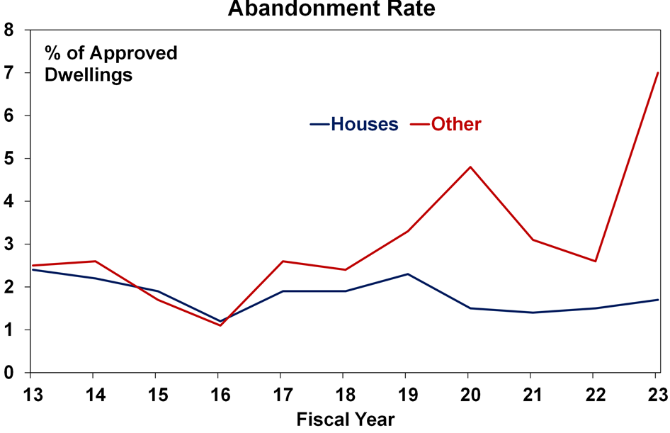 But the pipeline may not be as great as it appears because the abandonment rate (approved buildings that are never built) has spiked recently to around 7% recently for units. The previous chart also highlights the challenge Australian government’s will have meeting their commitment to build 240,000 dwellings a year over the next five years. Over the last four decades completions have never come near that. Maybe there is a chance if they are tiny homes!