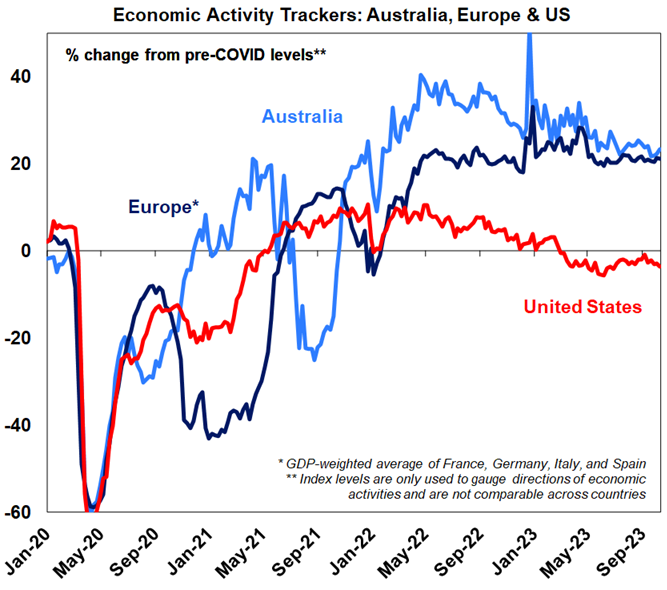 Levels are not really comparable across countries. Based on weekly data for eg job ads, restaurant bookings, confidence and credit & debit card transactions. Source: AMP