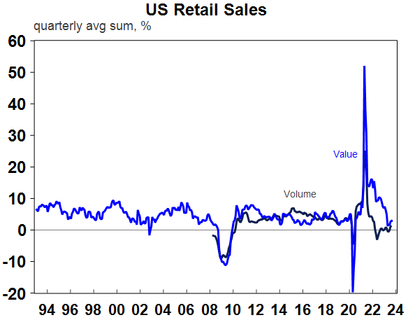 Major global economic events and implicationsUS data was a mixed bag over the last week. Retail sales rose solidly in September pointing to strong September quarter consumer spending, industrial production also came in better than expected and jobless claims remained low. But against this the volatile Philadelphia Fed and New York regional manufacturing indexes were mixed with one up and one down and the average remaining soft. Housing starts rose sharply in September, but this only partly reversed a sharp fall in August, the trend remains down and falls in mortgage applications and home builder conditions on the back of a surge in mortgage rates point to falls ahead in starts. Existing home sales also fell as did the index of leading indicators. And the Fed’s Beige Book suggested a soft take on economic conditions with “little to no change in activity”, labour market conditions continuing to ease and prices continuing to “increase at a modest pace”.