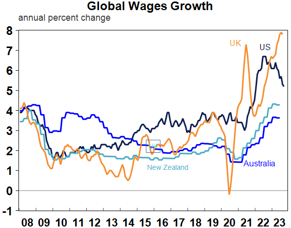 Pressure remains on the Bank of England. UK inflation was unchanged at 6.7%yoy in September and while core inflation fell to 6.1%yoy it was slightly higher than expected and services inflation rose further to 6.9%. What’s more wages growth remained elevated at around 8%yoy. Combined this maintains pressure on the BoE for a further rate hike. The risks are high though because payrolls are now falling. Fortunately for global markets, the UK is at the high end in global comparisons of inflation and wages growth. See the next two charts.