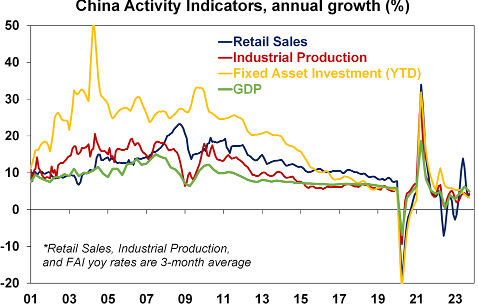 More signs that Chinese growth has bottomed with economic activity data stronger than expected. GDP slowed to 4.9%yoy in the September quarter, but this was stronger than expected with quarterly GDP growth of 1.3%qoq up from 0.5%. Growth in industrial production and retail sales also surprised on the upside in September and unemployment fell. This followed stronger than expected import, export and credit data. Policy stimulus seems to be helping but so far the trend in key data still remains soft (see the next chart) and property related risks remain high - with property sales and investment down and home prices continuing to fall in September - and policy stimulus announcements have stopped short of what may still ultimately be required.