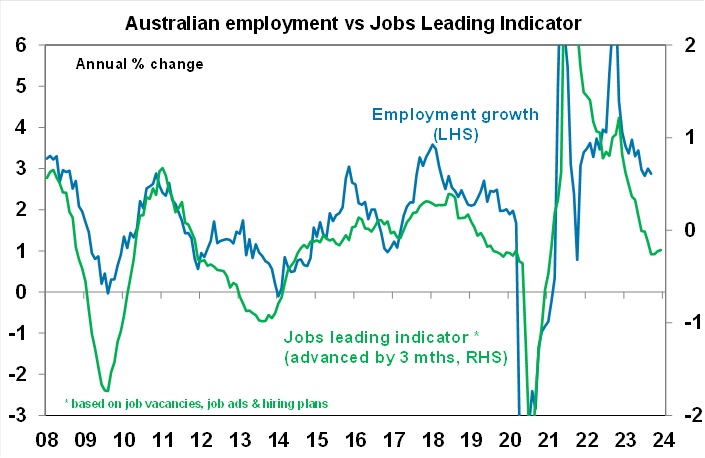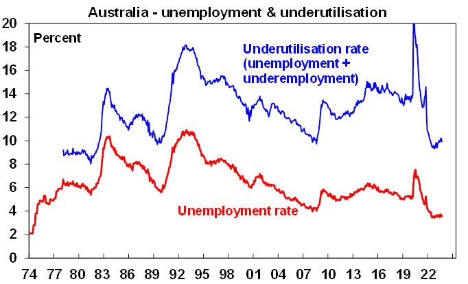 Australian economic events and implicationsAnother messy Australian jobs report for September. The jobs market is still tight with unemployment at just 3.6% and labour underutilisation at 9.9% is well below the average of the last four decades. But its continuing to cool with employment up a less than expected 6700, full time jobs down by 53,000 over the last three months, hours worked continuing to slow and job vacancies down for five quarters in a rose. And without a fall in the participation rate (which may be due to “discouraged workers”, statistical noise or both) unemployment would have increased to 3.9%.