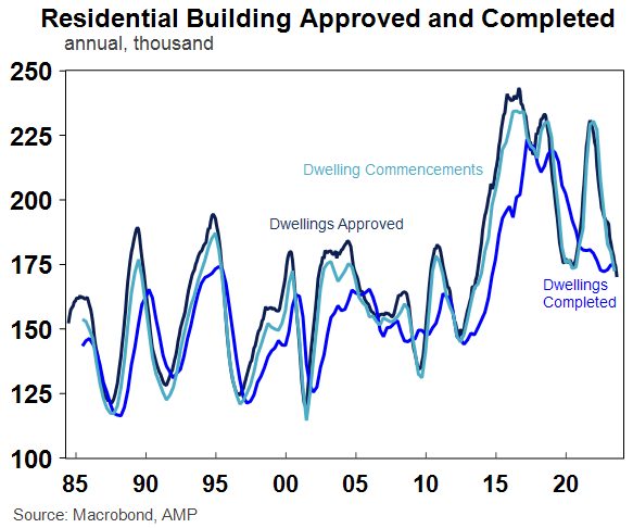 Australia’s still large home building pipeline. June quarter dwelling commencements showed that they are continuing to follow approvals down. What has been unusual in the last cycle is that there was no rise in dwelling completions to match the surge in approvals and commencements in 2021 because of labour and material shortages and failures of home builders. This of course means that there is a large pipeline of construction yet to be completed which will provide some support to building activity going forward….
