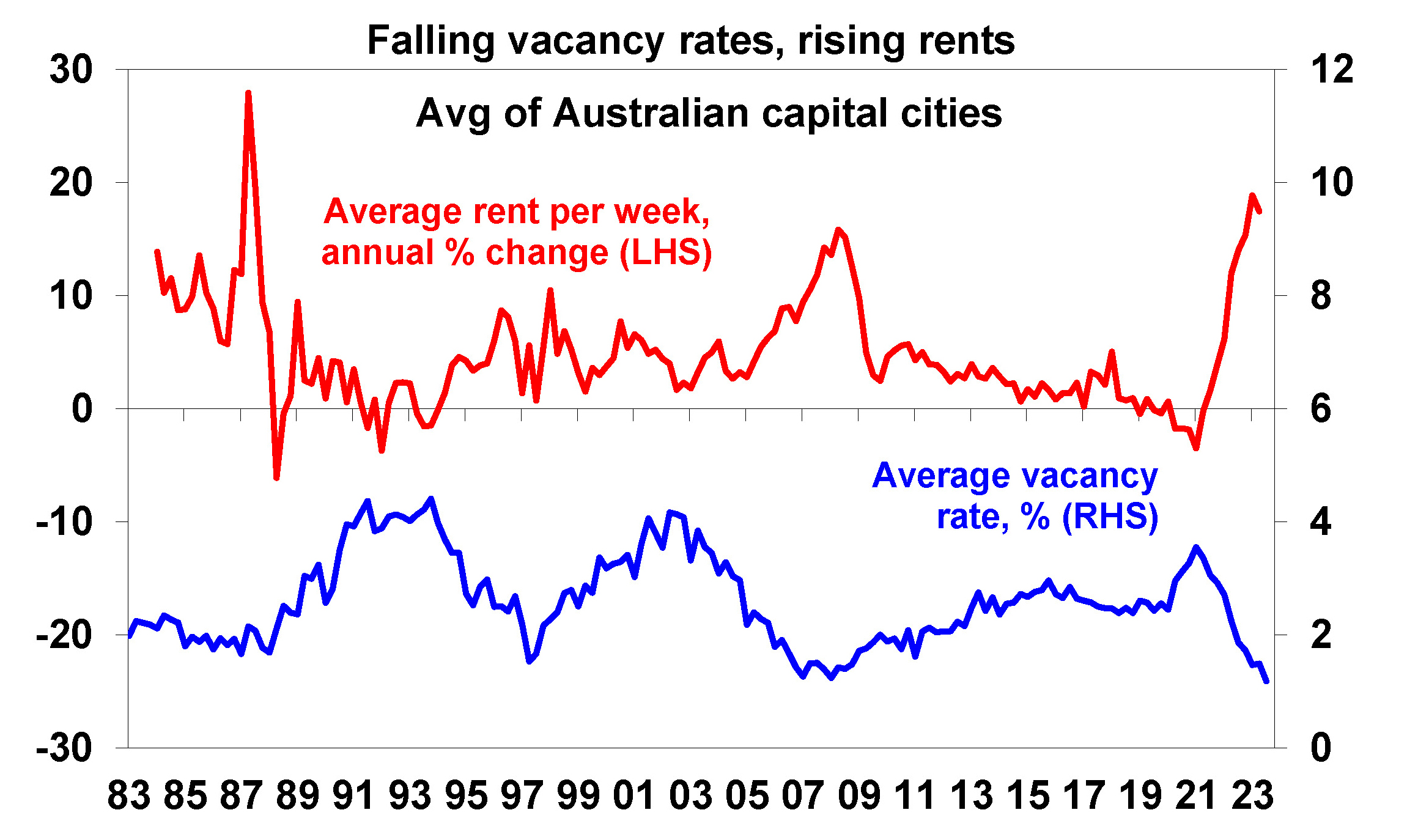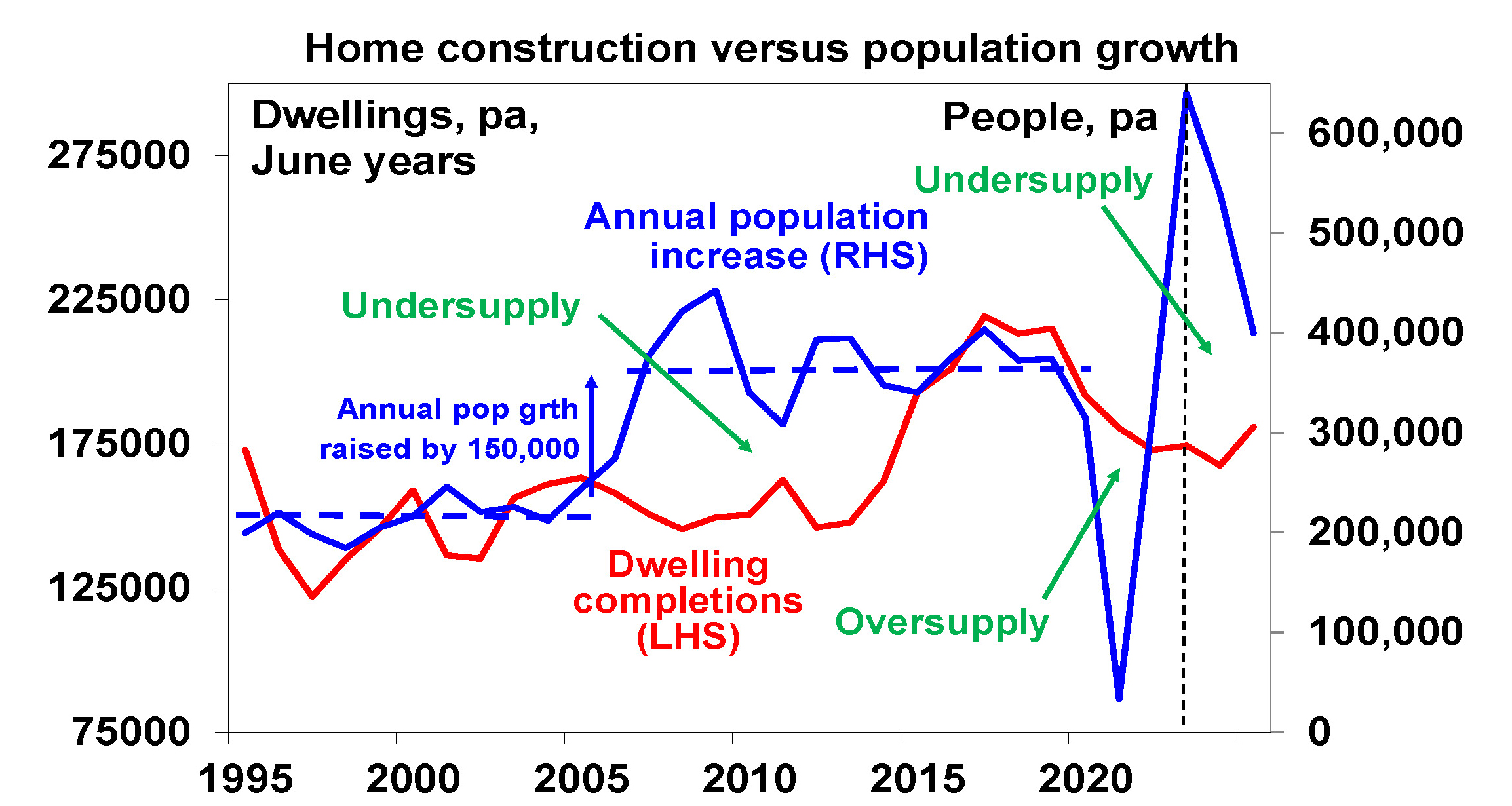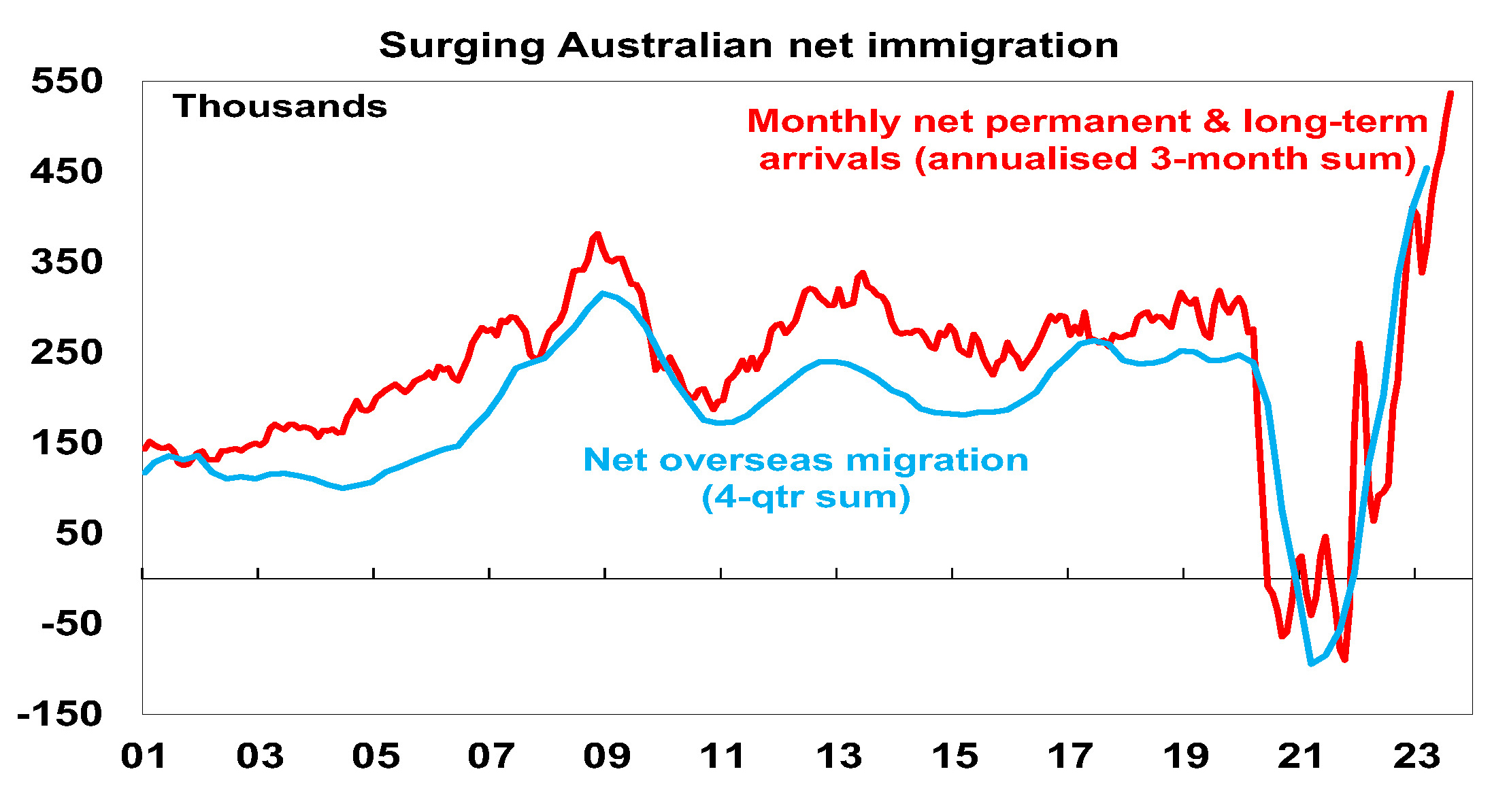 Supply shortfall still dominating for nowThe rebound in prices reflects a far worse than expected shortfall of supply relative to underlying demand for homes as immigration rebounded driving the fastest population growth rate since the 1950s at the same time that the supply of new dwellings slowed. This accentuated already tight rental markets, forcing rents up & driving renters to consider buying. So, demand improved but supply remains weak with total listings below normal. Talk of rising prices and shortages further boosted demand from less interest rate sensitive buyers. Expectations that rates were at or close to the top have also helped. Looking at the key elements of this: