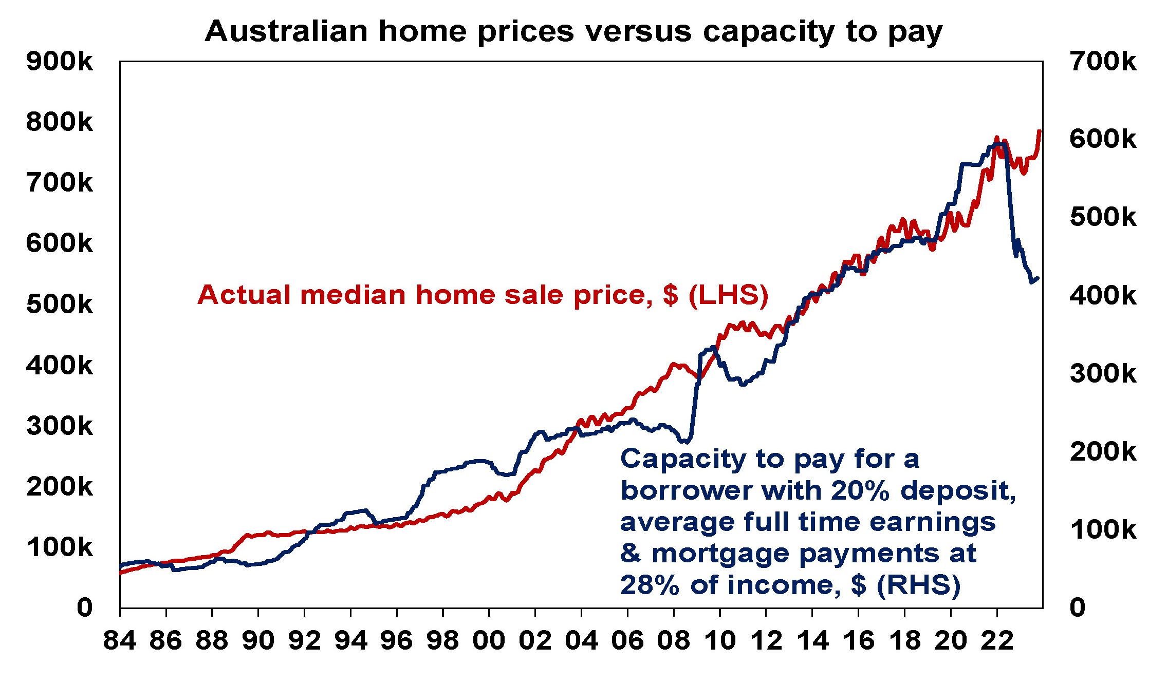 The rise in interest rates since May last year has caused a big hit to home buyer “capacity to pay”. We estimate that the capacity to pay for a home by a borrower with a 20% deposit on full time average earnings is around 29% lower than it was in April last year as they can’t borrow as much now on a given income. See the next chart. This threatens a downwards adjustment in home prices at some point unless incomes rise dramatically or mortgage rates fall dramatically. It may have been offset this year by a pool of less interest sensitive buyers (eg, those who had access to the bank of Mum and Dad) but that leaves the market vulnerable if such buyers are exhausted.