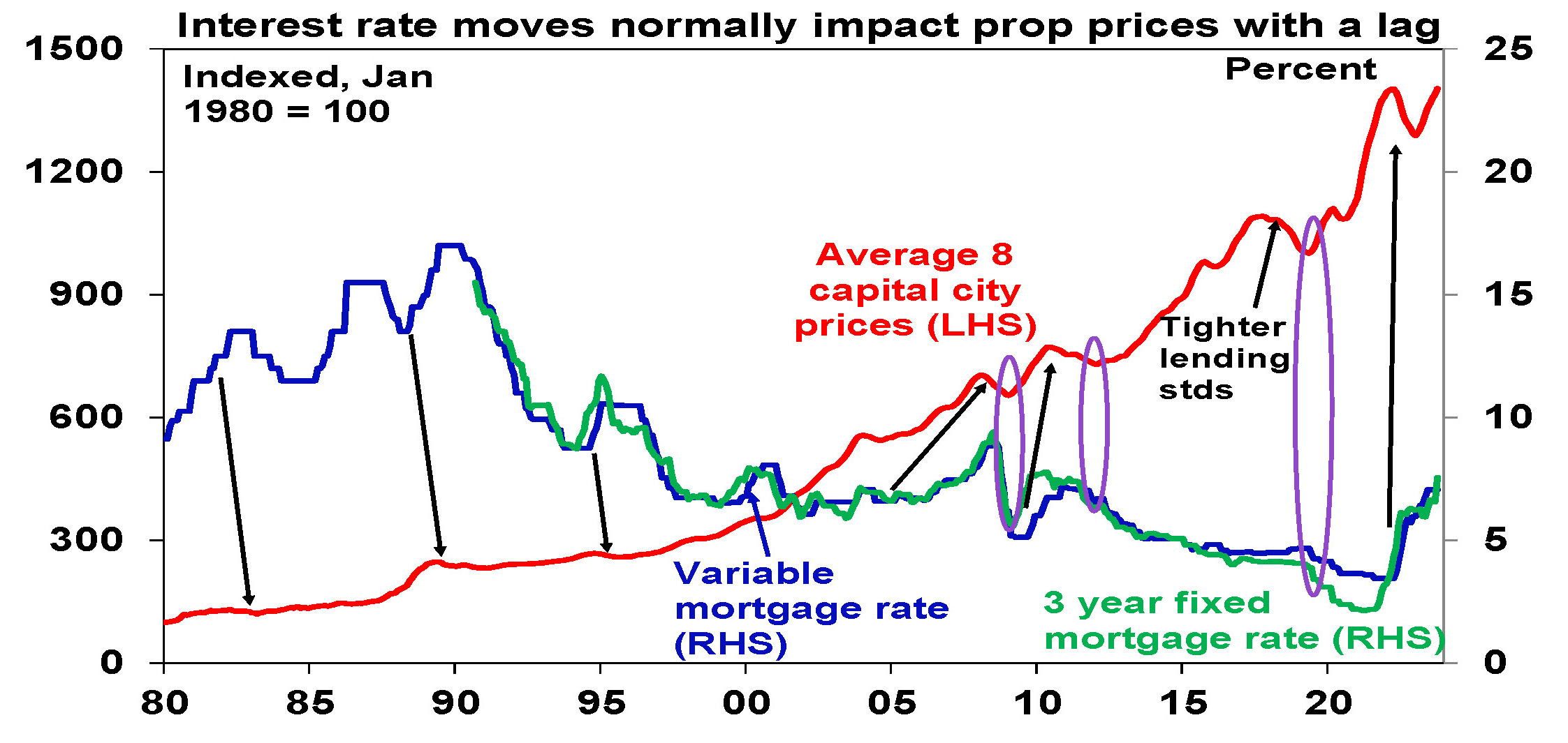 Just as rate hikes impact the economy with a lag it’s the same with the property market. This is because it takes time for rate hikes to cool demand, for unemployment to rise and for distressed sales to increase. So last year’s slump in property prices that started as soon as interest rates started to rise maybe ran ahead of itself. Similarly, the last three major cyclical upswings in home prices have required lower interest rates to be sustained. With rates cuts still a long way away, the impact of past rate hikes still feeding through to demand and listings, and the RBA looking like it will raise rates again, the risk of another leg down in prices is high.