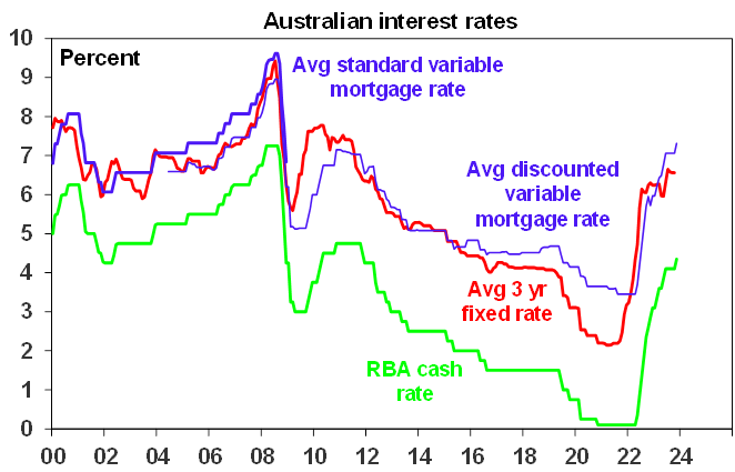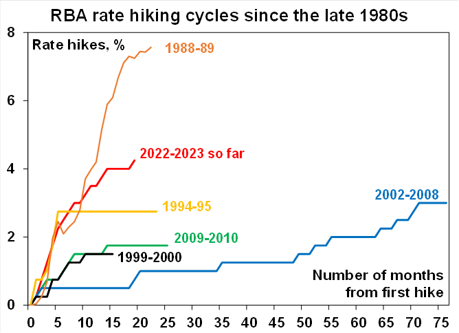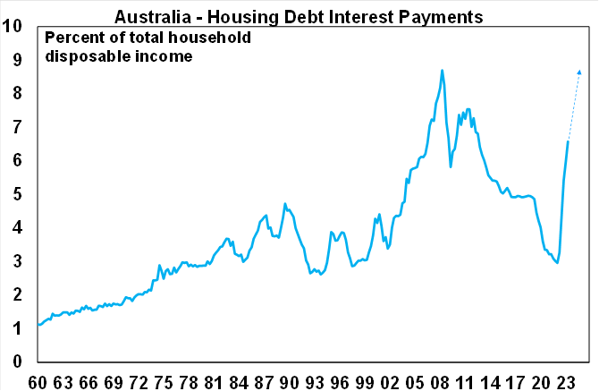 However, our assessment remains that that the RBA has already done more than enough to slow the economy in order to rebalance demand and supply and bring inflation back to target. Rate hikes impact the economy with a long lag as it takes a while for the hikes to be passed through to borrowers and for them to adjust their spending. This time around the lag has been lengthened by savings buffers built up in the pandemic, the reopening boost, more than normal home borrowers locking in at 2% of so fixed mortgage rates in the pandemic and the highly competitive mortgage market which has meant that actual mortgage rates paid on outstanding mortgages have gone up by less than the cash rate. However, these protections are now wearing off.