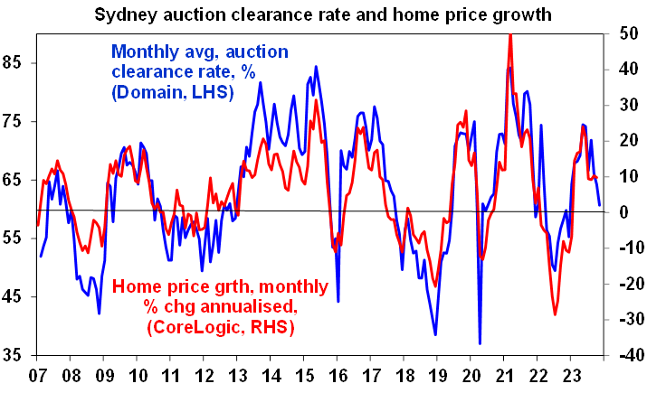 And finally... the latest interest rate rise along with the fear of more to come adds to the risk that high interest rates are starting to get the upper hand again in the property market after gains this year on the back of the housing supply shortfall in the face of booming immigration. The downtrend in auction clearance rates since May is already pointing to a sharp loss of momentum in home price growth.