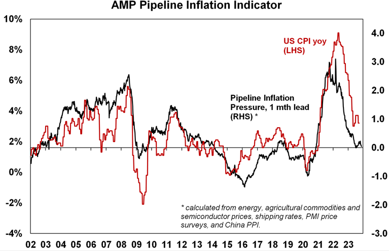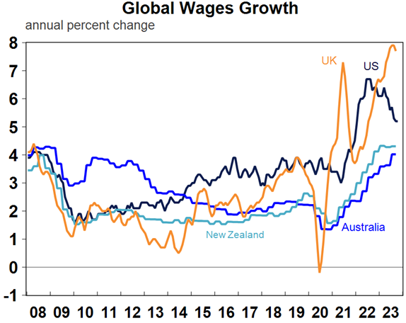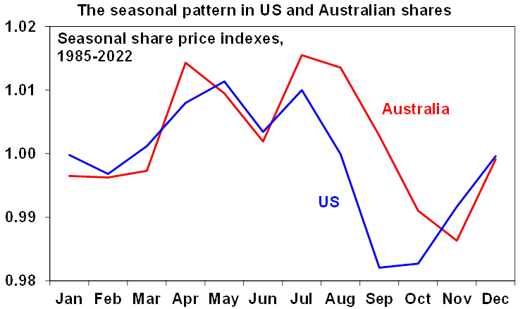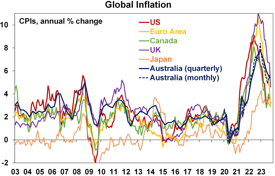 The good news on inflation is evident in the next chart showing inflation rates in major developed countries. While there is high anxiety about sticky services inflation, inflation is continuing to fall about as quickly as it went up. Relative to the US, Canada, Europe and the UK, Australian inflation lagged on the way up and peaked a little later (partly reflecting the slower reopening from covid) and it’s doing the same on the way down so there is no reason to be alarmed that its higher than in North America and Europe. More broadly, because the surge in global inflation led that in Australia, the decline in global inflation points to a further decline in Australian inflation ahead.