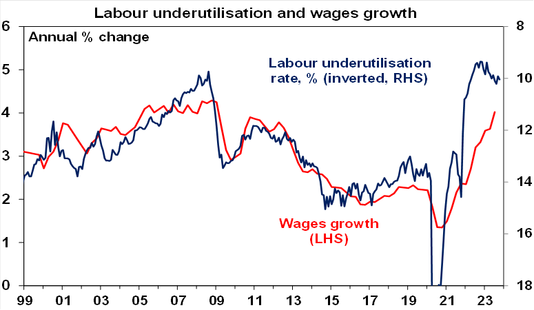 Both the wages and jobs data were a bit stronger than the RBA forecast but its marginal and not enough on their own to bring on another rate hike. The 3.7% unemployment rate for October is roughly consistent with the RBA’s forecast for 3.8% this quarter and the RBA forecast a rise in wages growth to 4% and with its business liaison program pointing to a slowing in wages growth next year it’s not likely to be too concerned. So, on their own they are unlikely to trigger a rate hike next month. Our base case remains that rates have peaked, but the risk of another hike remains high (at around 40%) particularly if upcoming retail sales and inflation data are stronger than expected and if productivity growth remains weak.