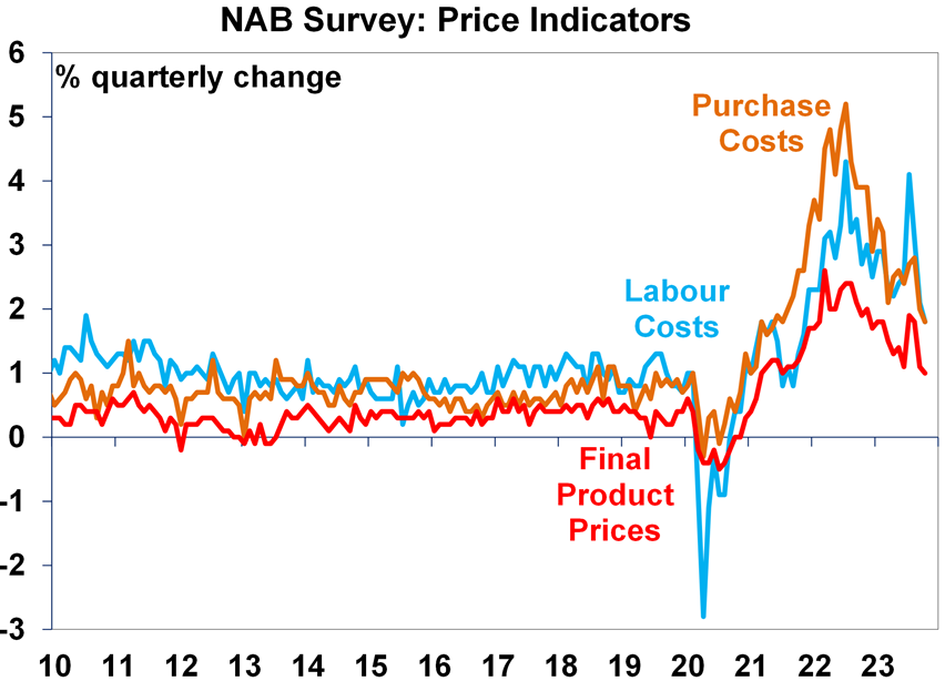 But the good news is that the NAB survey showed a further fall in cost and price pressures after a mid-year spike. This adds to confidence that the rise in minimum and award wages has not led to an ongoing surge in other wages.