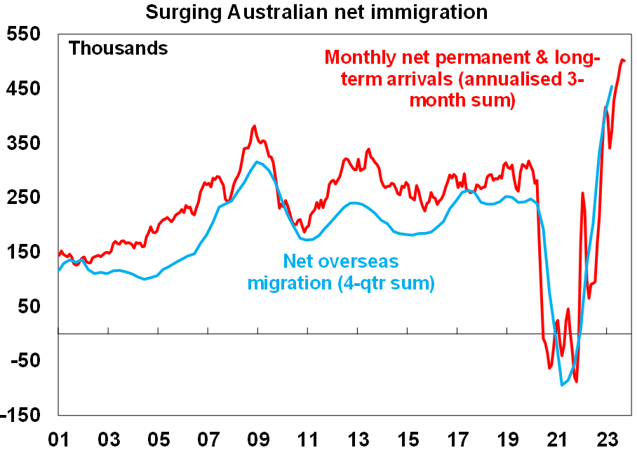 Meanwhile monthly permanent and long term arrivals data point to a continuing surge in population growth with net migration running around 500,000 people or more per annum. This is way above last year’s March budget forecast of 180,000 for 2022-23 and it’s hard to see it falling back to the 315,000 forecast for this financial year in this year’s May budget. With home building depressed the housing shortfall will worsen this financial year with Australia on track to build around 70,000 less dwellings than we need adding to an existing shortfall of around 120,000 dwellings.