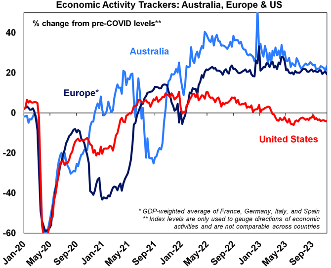 Levels are not really comparable across countries. Based on weekly data for eg job ads, restaurant bookings, confidence and credit & debit card transactions. Source: AMP