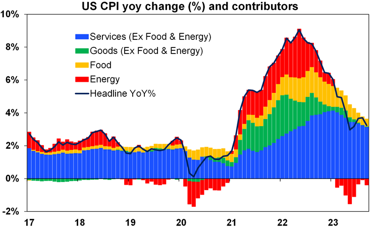 US inflation surprised on the downside in October adding to the case that the Fed has finished hiking, although sticky services inflation (blue bars in the next chart) will likely see the Fed retain a tightening bias and a “high for longer” message for now. CPI inflation was flat in the month and fell to 3.2%yoy (down from a high of 9.1% mid last year), core CPI inflation fell to 4%yoy and producer price inflation slowed to 1.3%yoy.