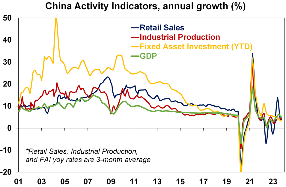 Chinese economic activity indicators for October showed more signs that growth has bottomed. Retail sales came in stronger than expected at 7.6%yoy and industrial production and investment were roughly in line with expectations. Growth looks on track for around 5% this year, but the key risk remains the property sector where sales, prices and investment remain weak. The latter probably explains recent reports that the PBOC will provide 1 trillion Renminbi (about $A215bn) in cheap housing finance.