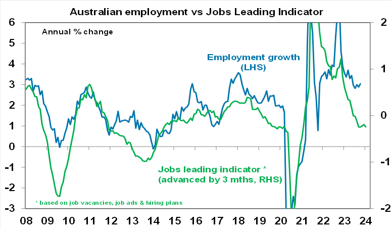 Australian economic events and implicationsAustralian jobs data surprised on the upside in October, but unemployment is roughly tracking RBA forecasts and jobs leading indicators continue to point to softness ahead. The 55,000 gain in employment was likely boosted by referendum workers and was mainly in part-time jobs so some reversal is likely this month. The jobs market is still tight but its gradually easing with unemployment (at 3.7%) and underemployment (at 6.3%) both up from their lows in October last year and various leading indicators point to softer jobs growth head including a rising trend in applicants per Seek ad a rise in consumer unemployment expectations. Our Jobs Leading Indicator continues to point to softer jobs growth.