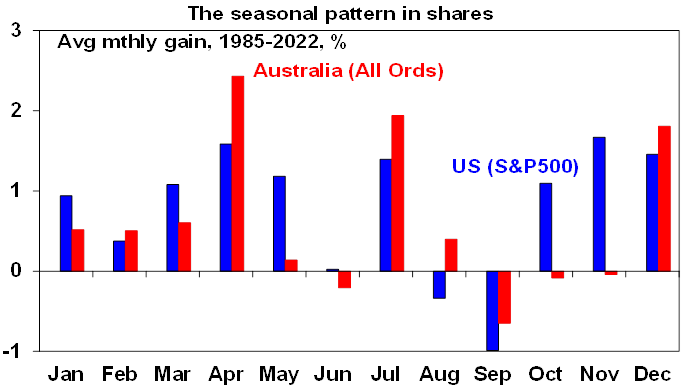 - Shares remain vulnerable to concerns about sticky inflation, recession fears, worries about the Chinese economy and geopolitics but they are likely to see more upside in the months ahead as inflation continues to ease, the monetary policy environment turns progressively less threatening and then more supportive and positive share market seasonality remains in place with the Santa Rally normally kicking in from about now. So, while we should expect lots of bumps along the way our base case remains that global and Australian shares can trend up.