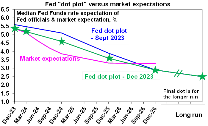 - The Fed is the most dovish arguably reflecting the fact that its inflation rate peaked in June 2022 which was several months ahead of other countries (October 2022 for the Eurozone and UK and December 2022 in Australia) and so its seen a longer period of slowing. It held rates at 5.25-5.5% as expected but has become dovish in noting that growth and inflation have slowed, is now referring to what will determine “any” additional tightening, has started to discuss rate cuts and its dot plot of Fed officials’ interest rate forecasts is now allowing for three rate cuts next year. We expect the Fed to start cutting interest rates in the June quarter.