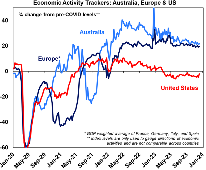 Levels are not really comparable across countries. Based on weekly data for eg job ads, restaurant bookings, confidence and credit & debit card transactions. Source: AMPMajor global economic events and implications- Global economic data over the last week remained consistent with soft growth and falling inflation. December developed country composite business conditions PMIs rose slightly but remained weak at an average 49.6. Price indicators also rose slightly but remain well down from their highs.