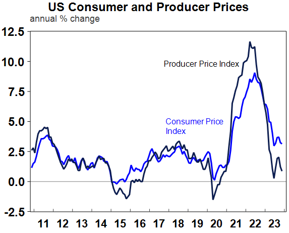 Source: Macrobond, AMP- US November consumer price inflation came in roughly in line with expectations falling to 3.1%yoy with core inflation unchanged at 4%yoy. While core services excluding shelter inflation is still a bit sticky slowing wages growth points to a slow down in it too. Falling producer price inflation also points to a further fall in CPI inflation & suggests November core private final consumption deflator inflation (which the Fed targets) will be soft with the six month pace actually running at or below the Fed’s 2% target.