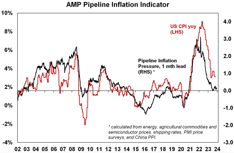 Source: Macrobond, AMP- Our Pipeline Inflation Indicator for the US continues to point to a further fall in inflation.