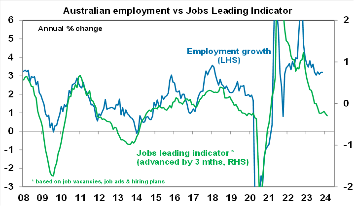 Source: ABS, AMP- And our Jobs Leading Indicator continues to point to slower jobs growth ahead on the back of falling vacancies and hiring plans. Given the surging population more than 30,000 new jobs are required each month to stop unemployment rising and the Jobs Indicator suggests we will soon fall below that.