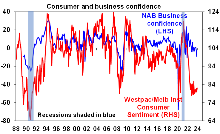 Source: ABS, AMP- Confidence remains weak. Consumer confidence rose slightly in December on the RBA rate pause but remains depressed and business confidence in the NAB survey fell, albeit business conditions are still okay but also falling. All things being equal this is consistent with soft growth.
