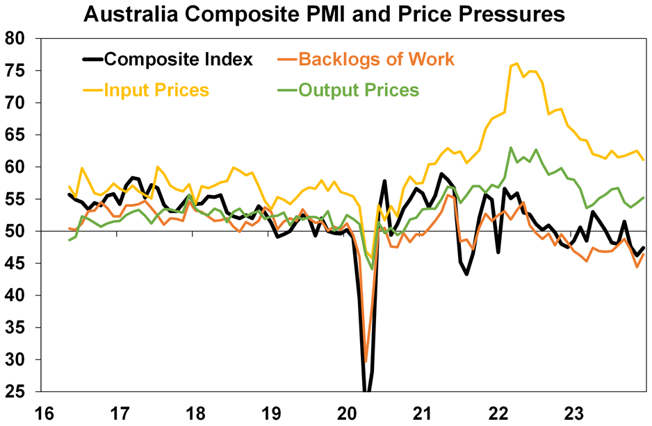Source: NAB, Westpac/MI, AMP- The business conditions PMI for December improved slightly but remain weak, with depressed new orders. Price and cost indicators remain well down from their highs but are still a bit elevated and work backlogs are weak.