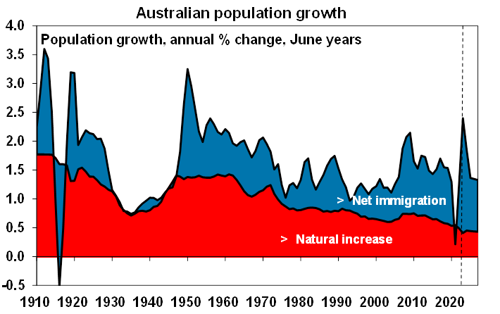 Source: Bloomberg, AMP- Strongest population growth since 1956. Australia’s population rose by 2.4% in 2022-23 its fastest pace since 1956, driven by record immigration of 518,000 people with students on 1 year or more visa’s being a big driver. This is way above the 180,000 net migration forecast at the time of the March 2022 Federal Budget. The surge in immigration may have helped support the economy and ease labour shortages but its done nothing to boost per capita GDP (which is in recession) and has added to demand and hence inflation and likely led to higher than otherwise interest rates. The strains are most evident in the housing shortfall which has contributed to surging rents and record home prices.